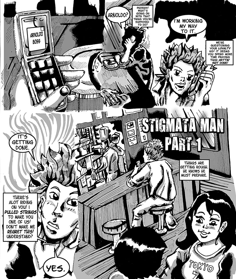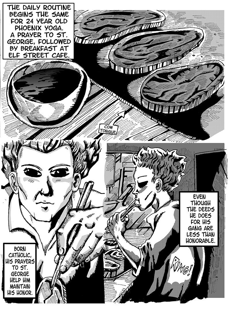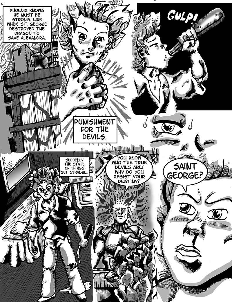 Phoenix Yoga is compelled by seeing the vision of St. George in reflective surfaces, to become a vigilante. He knows his enemy through the affliction of stigmata.